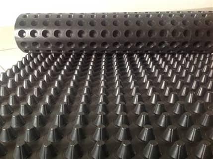 特殊工藝壓型在土工膜上壓出封閉突起的圓臺狀、柱狀、球冠狀殼體,形成的一種膜、殼連續,具有立體空間和一定支撐剛度。結合表面鋪貼的無紡土工布濾水層。構架出架空層,利用架空層形成排水、排氣通道,同樣利用架空層達到隔音、隔振的功能。在排水板上鋪貼的土工布濾水層阻止泥土微粒通過,避免通道阻塞,使孔道排水順暢,從而形成一個具有滲水、貯水和排水功能的系統。
